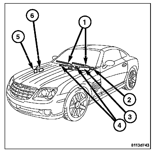 - Wiper Module - The wiper module (3), except the two pivot shafts, is concealed within the cowl plenum beneath the cowl grille. It includes the module bracket, three rubber-isolated mounts, the wiper motor, the wiper motor crank arm, the wiper linkage and wiper pivot shafts.