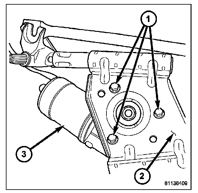 2. Install the three wiper motor attachment bolts (1) and torque to 11 Nm (8.1 ft. lbs.).