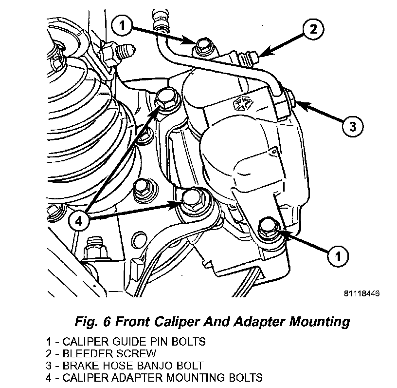 5. Align caliper guide pin bolt holes with guide pins, then install caliper guide pin bolts (Fig. 6). Tighten upper (closest to bleeder screw) bolt to 43 Nm (32 ft. lbs.) torque, then tighten lower bolt to 43 Nm (32 ft. lbs.) torque.