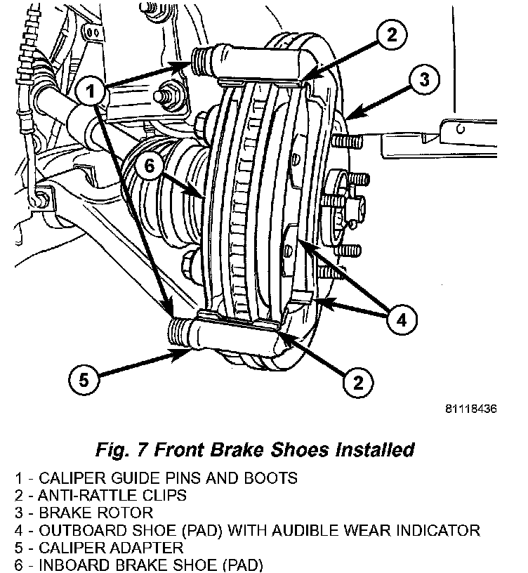 7. Remove two brake caliper guide pin bolts (Fig. 6).