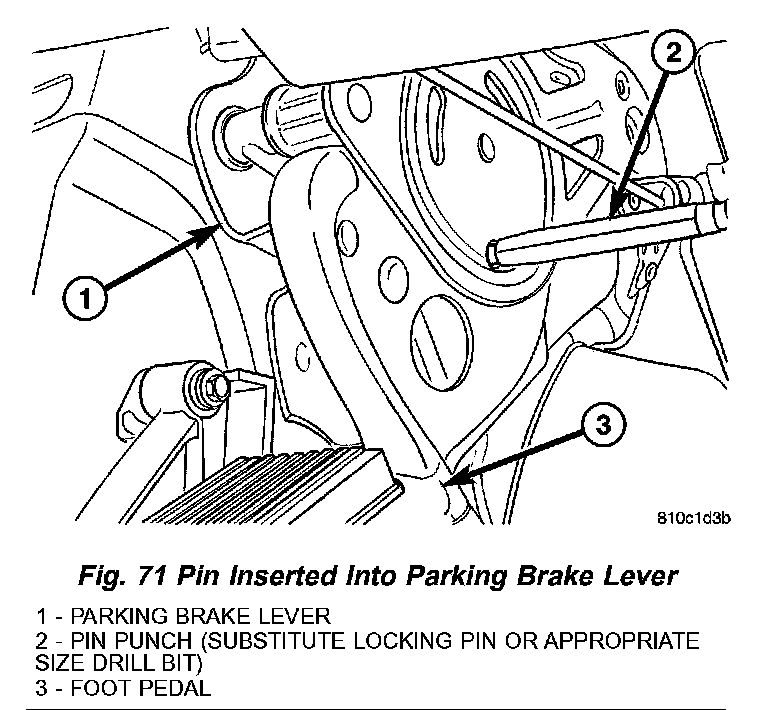 2. Keeping hands clear of automatic adjuster sector and pawl area, firmly grasp pin punch (drill bit, or locking pin if a new lever has been installed) installed in lever mechanism (Fig. 71), then quickly remove it from parking brake lever mechanism. This action allows parking brake lever mechanism to automatically take up any slack.