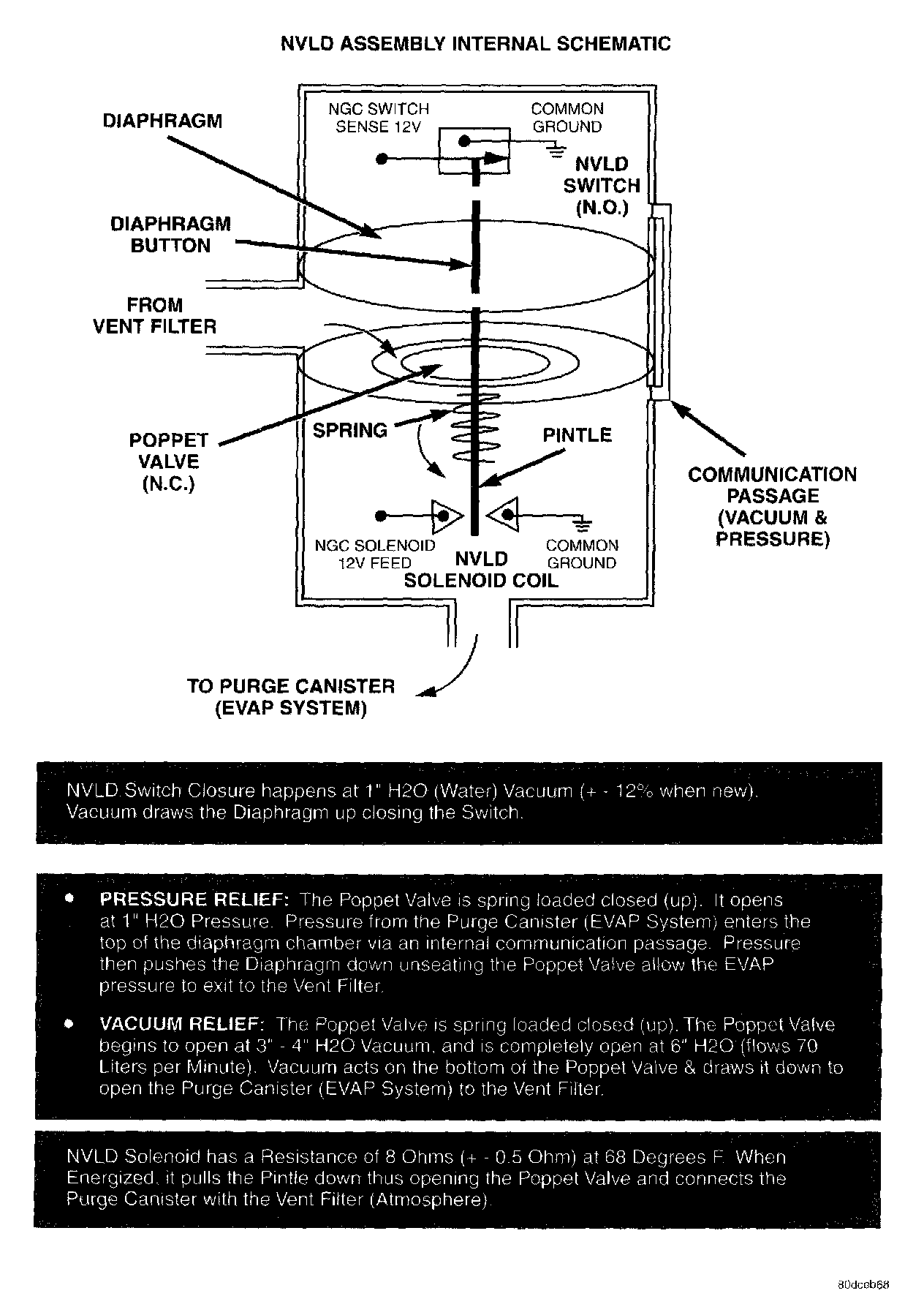 The normally closed valve in the NVLD is intended to maintain the seal on the evaporative system during the engine off condition. If vacuum in the evaporative system exceeds 3 inches to 6 inches H2O (0.75 to 1.5 kPa), the valve will be pulled off the seat, opening the seal. This will protect the system from excessive vacuum as well as allowing sufficient purge flow in the event that the solenoid was to become inoperative. The solenoid actuates the valve to unseal the canister vent while the engine is running. It also will be used to close the vent during the medium and large leak tests and during the purge flow check. This solenoid requires initial 1.5 amps of current to pull the valve open but after 100 ms. will be duty cycled down to an average of about 150 mA for the remainder of the drive cycle.