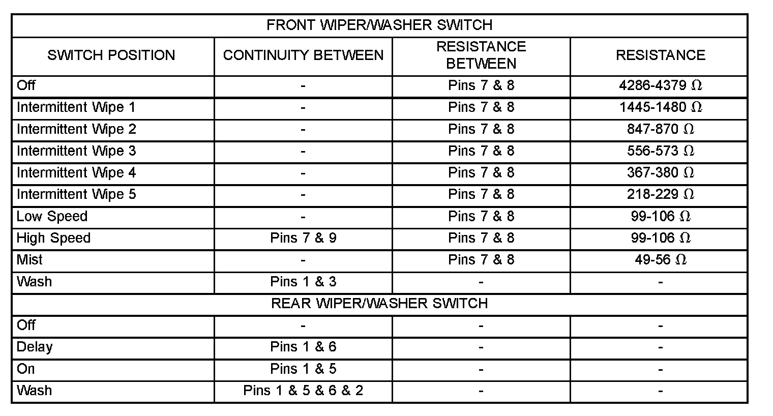 Right (wiper) Multi-Function Switch Continuity/Resistance: