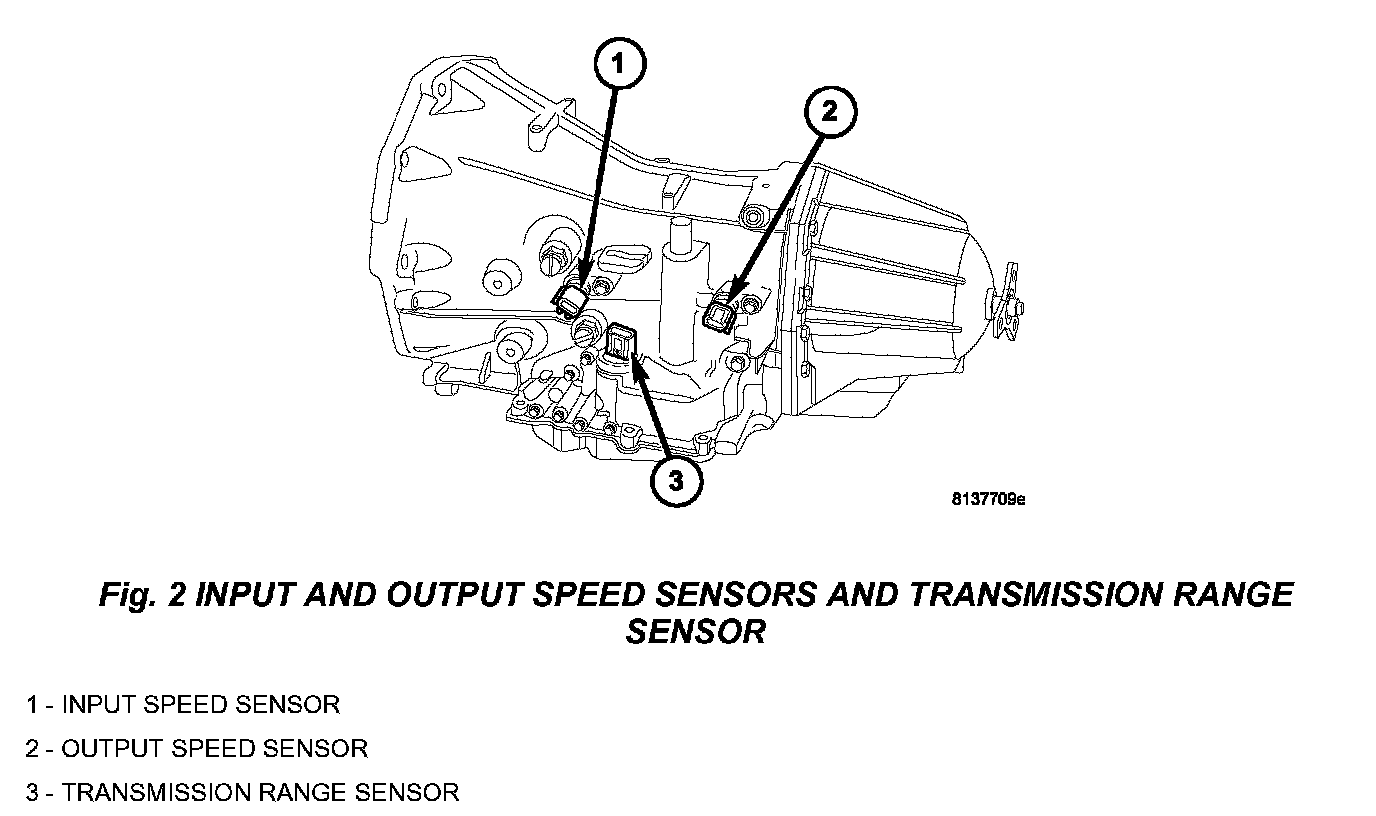 8. Disconnect the input speed sensor connector, output speed sensor connector, and the transmission range sensor connector (Fig. 2).