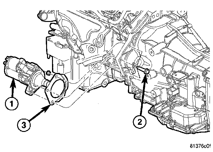 6. Remove the bolts (2) holding the starter motor (1) to the transmission.