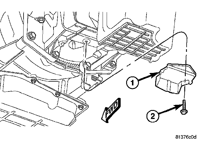 8. Remove the bolt (2) holding the torque converter access cover (1) to the transmission, 3.5L engines.