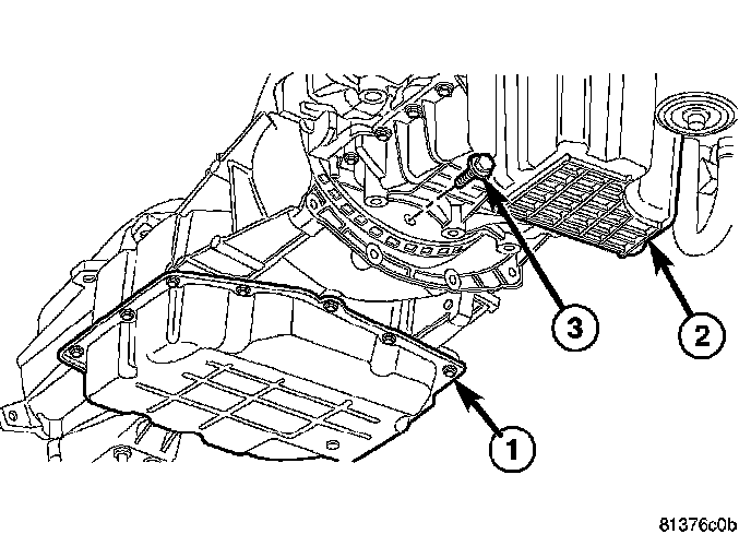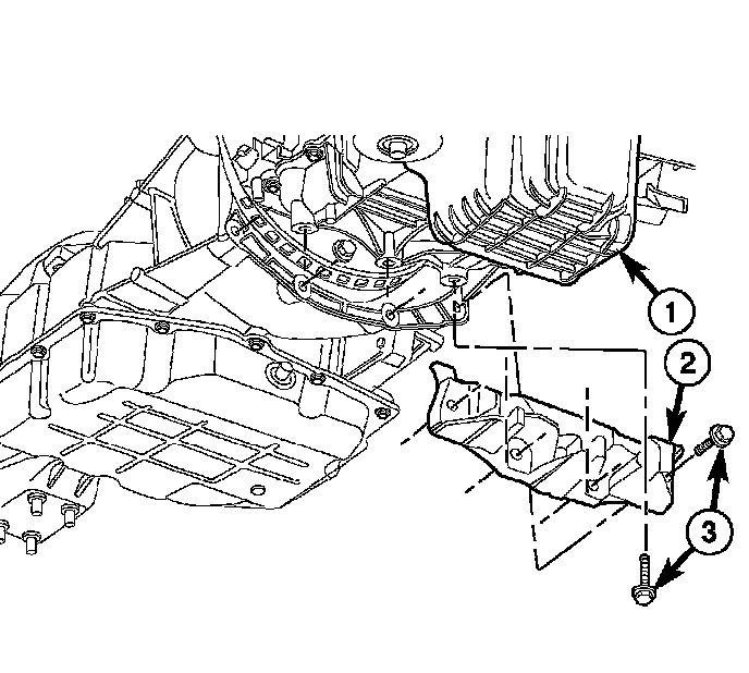 27. Remove the bolts (1) holding the engine oil pan (2) to the transmission (3).