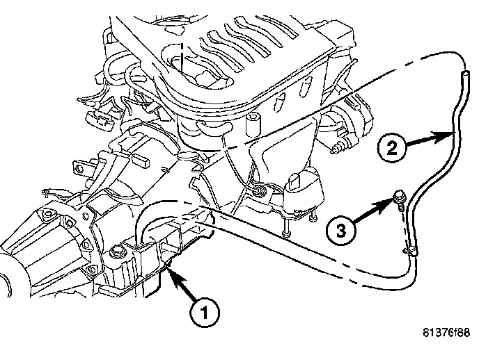 19. Remove the bolt (3) holding the transmission fill tube (2) to the transmission (1).