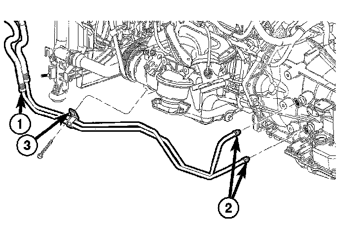 21. Disconnect transmission fluid cooler lines (1) at transmission fittings (2) and clips (3).