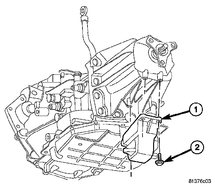 13. Loosen the bolts holding the shift cable retaining strap (2) to the transmission.