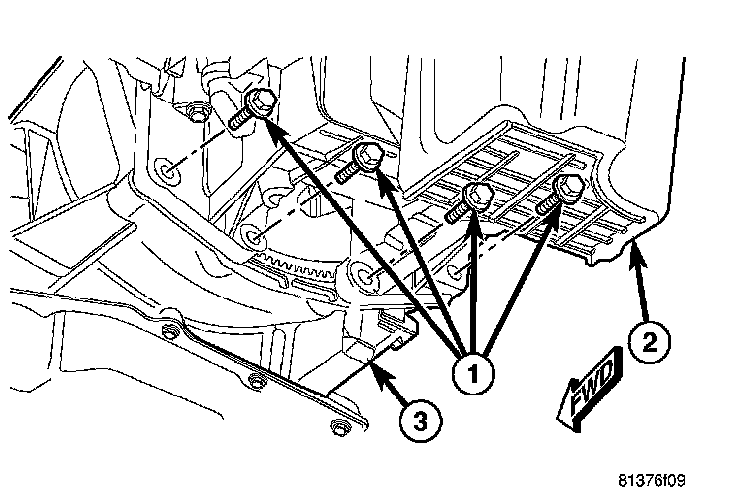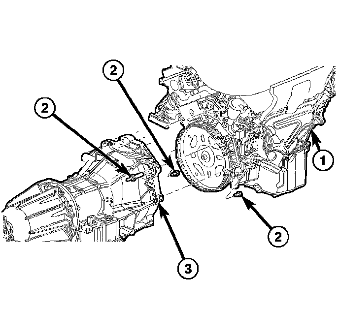 28. Remove all remaining bolts (2) holding the engine (1) to the transmission (3).