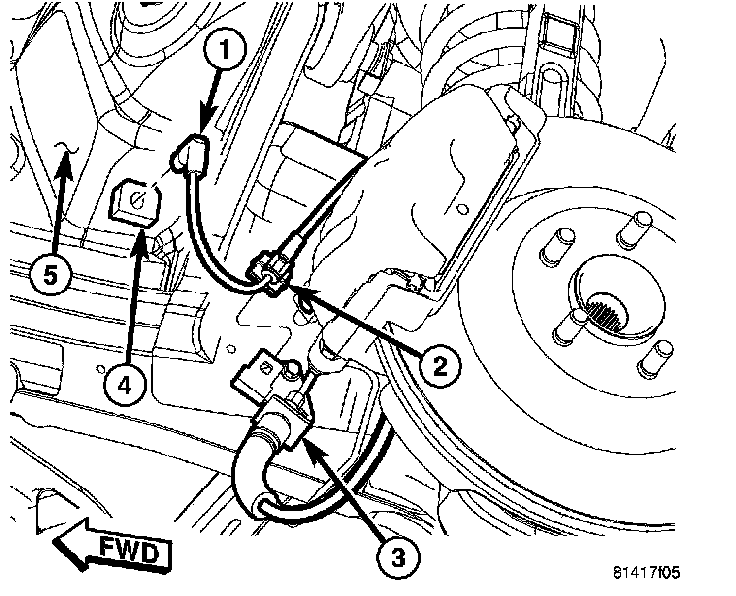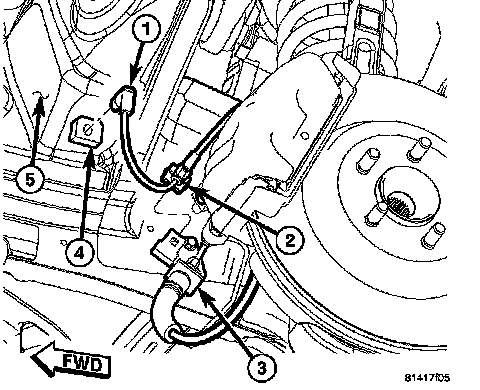 2. Remove sensor cable routing clip (2) from brake hose bracket (3).