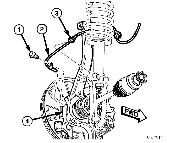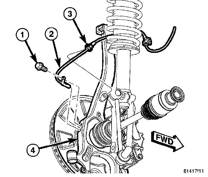 1. Install wheel speed sensor (2) head into knuckle (4) and install mounting screw (1). Tighten screw to 11 Nm (95 inch lbs.) torque.