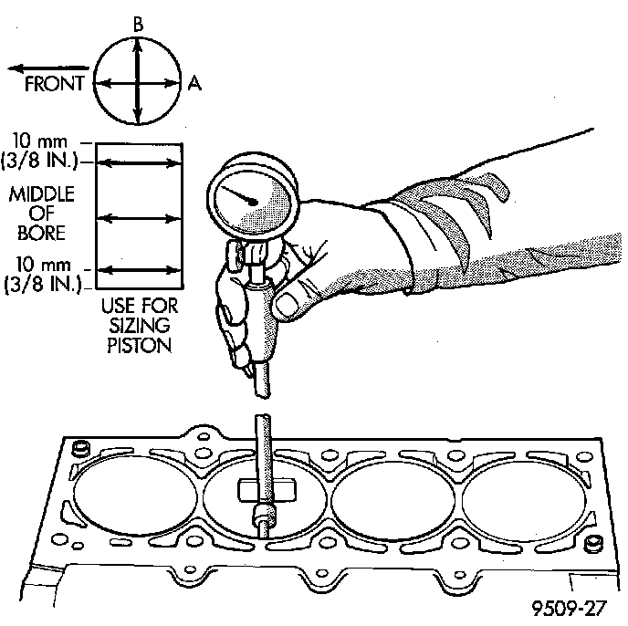 Measure the cylinder bore at three levels in directions A and B. Top measurement should be 10 mm (3/8 inch) down and bottom measurement should be 10 mm (3/8 inch) up from bottom of bore.