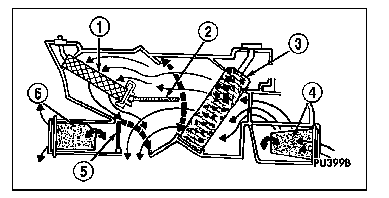 The heating-A/C system pulls outside (ambient) air through the cowl opening at the base of the windshield, then into the air inlet housing and through the A/C evaporator (3). Air flow can be directed either through or around the heater core (1). This is done by adjusting the blend-air door(s) (2) with the temperature control(s) located on the A/C-heater control in the instrument panel. The air flow can then be directed from the panel, floor and defrost outlets in various combinations using the mode control located on the A/C-heater control. Air flow velocity can be adjusted with the blower speed control located on the A/C heater control.
