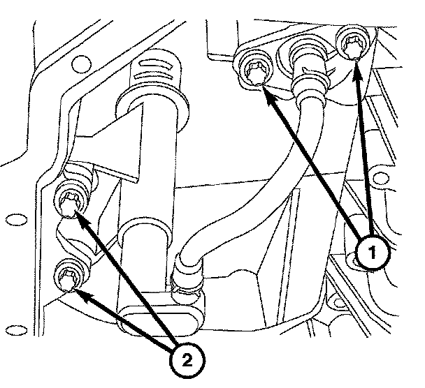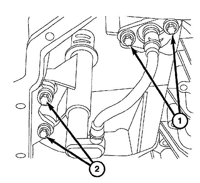 4. Remove the two harness retainer screws (2) and the oil level/temperature sensor.
