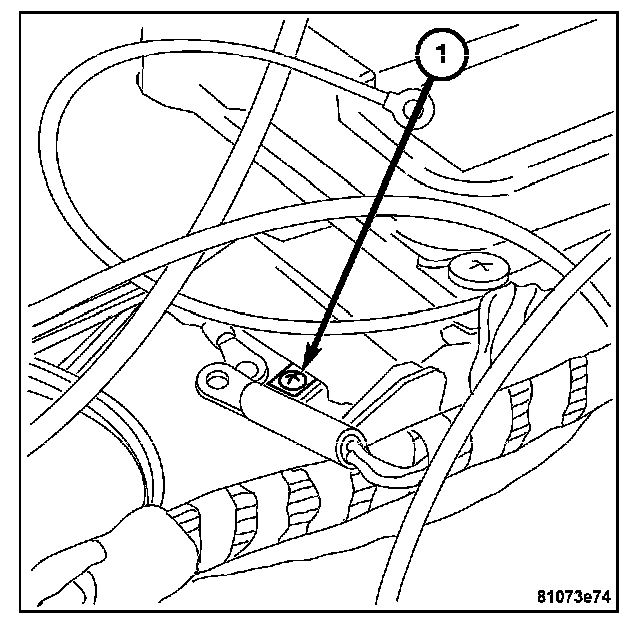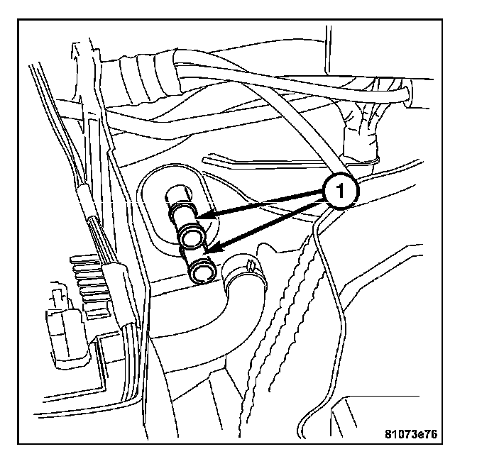 5. Remove the hot water hose clamp (1) located inboard from the brake booster on the bulkhead, then remove and plug off the hot water hose.