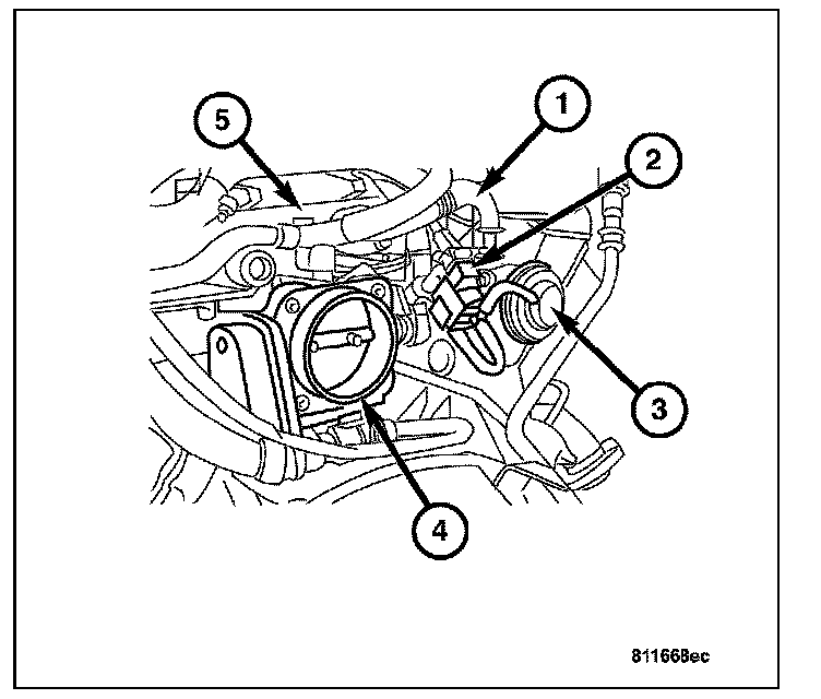The EGR Valve (3) is located at the right rear of the engine and is attached to the right cylinder head, to the right of the Throttle Body (4).