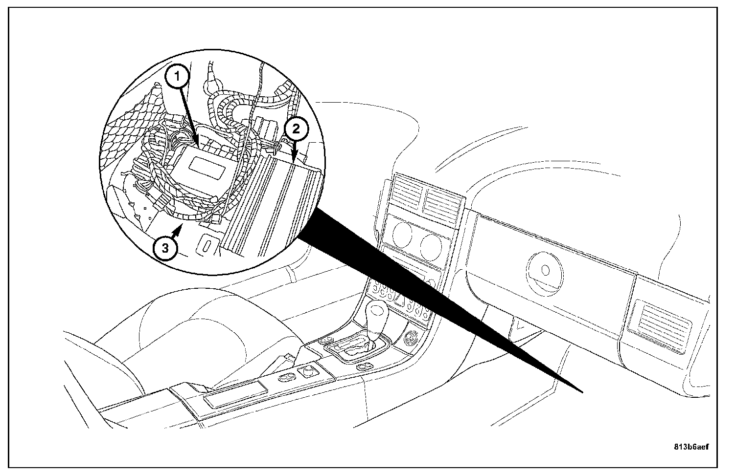 The Transmission Control Module (1) is located in the interior passenger compartment on the passenger side. It is mounted behind a base plate (3) in the passenger side footwell next to the Radio Amplifier (2). The carpet must be pulled pack and the base plate unfastened and flipped down in order to access the Transmission Control Module.