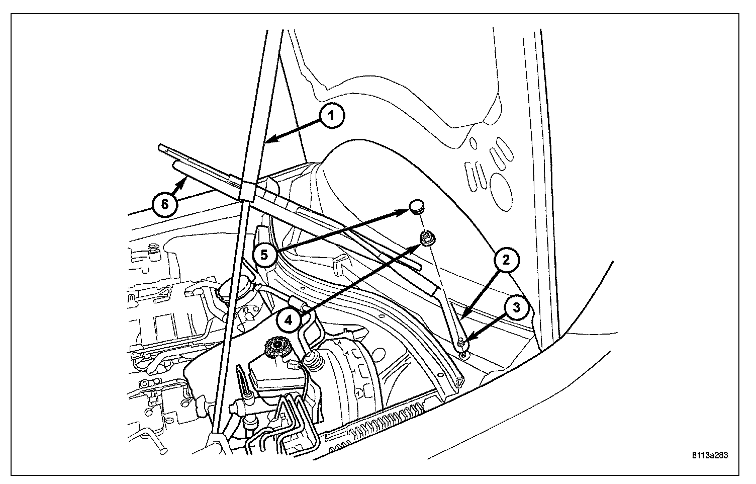 1. Open the hood, then press the hood prop release button on the hood prop outer sleeve to extend the hood prop fully (1).