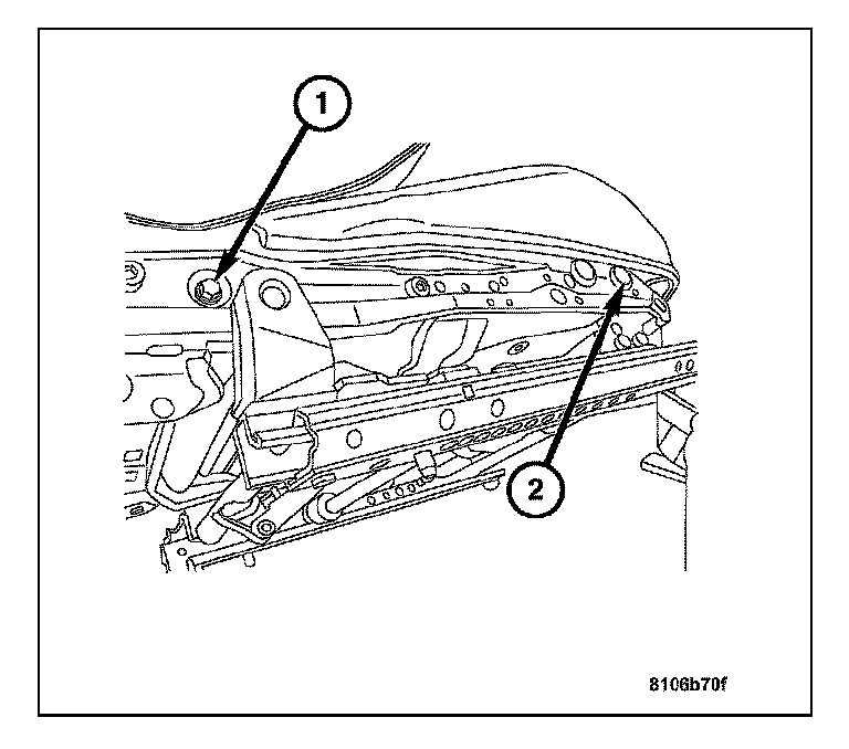 4. Tilt the rear track mechanism outward then remove the power seat track front inboard and outboard attachment bolts (2).