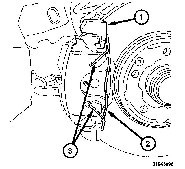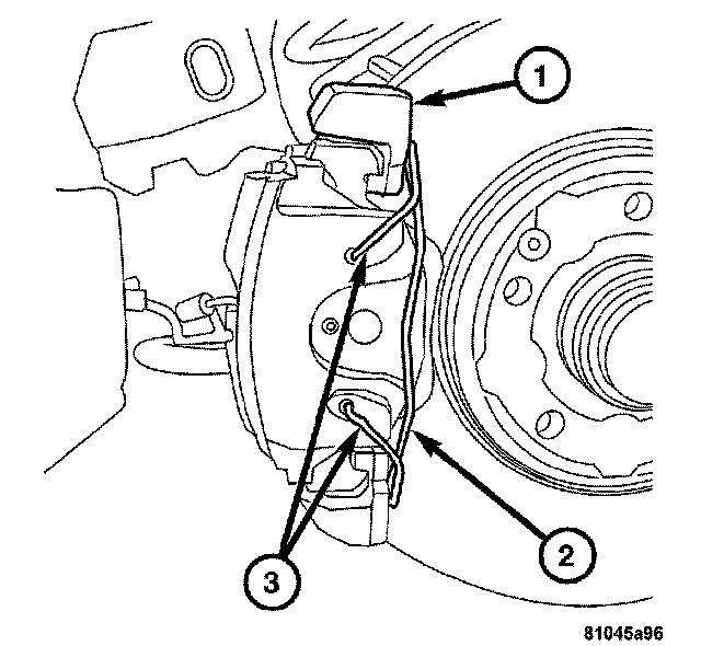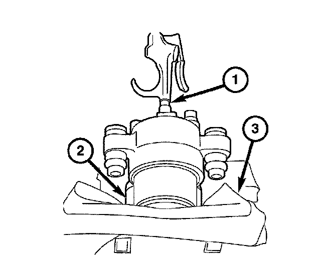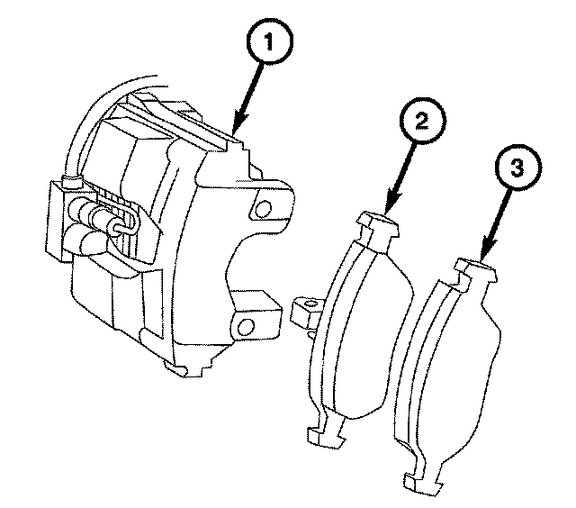 1. Install the inboard and outboard brake pads (2 and 3) onto the caliper (1).