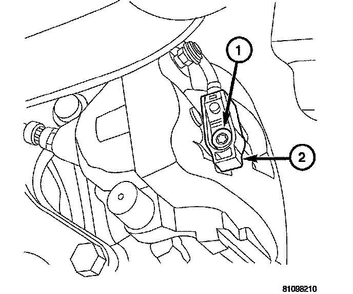 6. Install the brake pad wear indicator (2) onto the caliper. Tighten the bolt to 8 Nm (6 ft. lbs.).