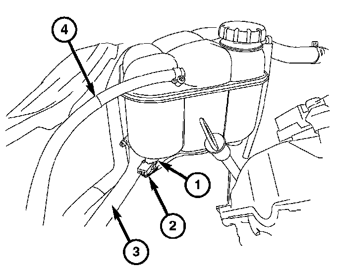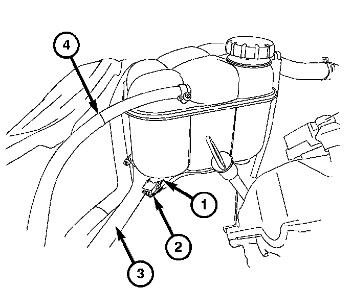 3. Depress the locking tabs and pull the coolant level sensor (1) from the coolant recovery reservoir.