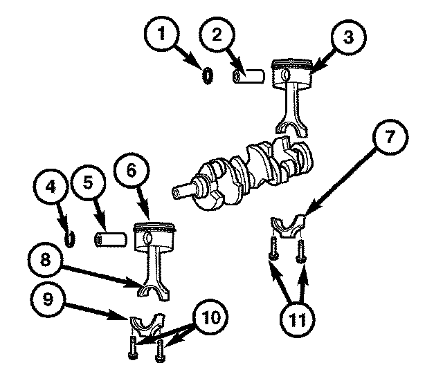 Flat-topped aluminum pistons (3 and 6) have machined pockets for valve clearance and asymmetrical skirts for low-temperature noise control. The pistons are formed from a special aluminum alloy to cope with the high temperatures created by dual ignition. In addition, the upper portions are hard anodized to protect the top ring. For optimal wear protection, the piston skirts receive an iron coating. Three, low-tension piston rings provide compression control with low oil consumption. Forged steel connecting rods (8) and crankshaft provide requisite strength with light weight. Connecting rods are forged in one piece from steel, and cracked rather than machined along the split line, providing a perfect fit for the two halves and reducing weight by 20 percent compared to a fully machined rod and cap while also greatly reducing machining. The rods are drilled longitudinally to deliver oil under pressure to the wrist pins (2 and 5), minimizing wear for long life.