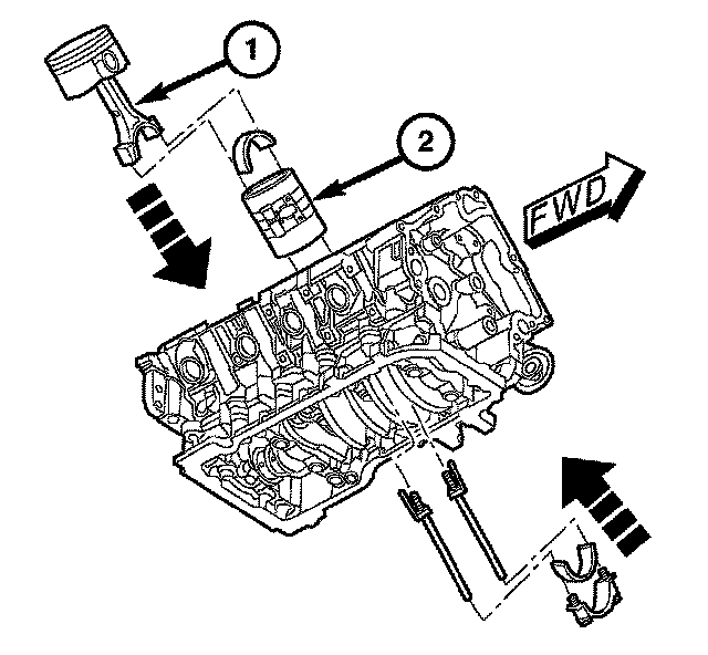 Note: The connecting rod bearing shell with the oil drilling (2) must be installed in the connecting rod, otherwise the connecting rod bearings will not be lubricated. The anti-twist locks of the connecting rod bearing shells must be located in the slots (1) of the connecting rods and the connecting rod bearing caps.