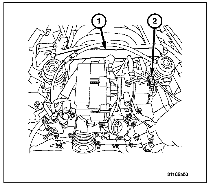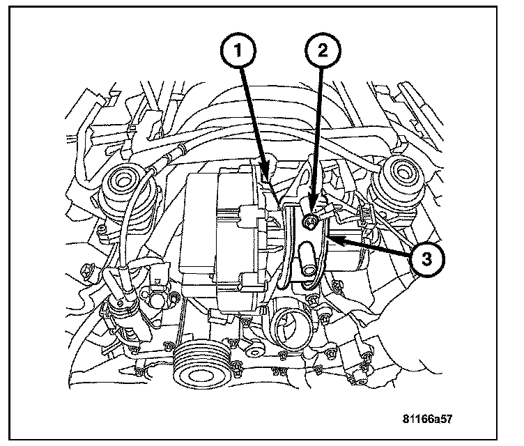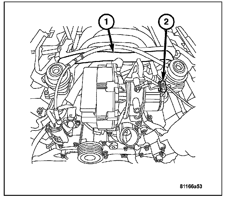 2. Install the air pump retaining bolt (2). Tighten bolt to 20 N.m (177 in. lbs.).