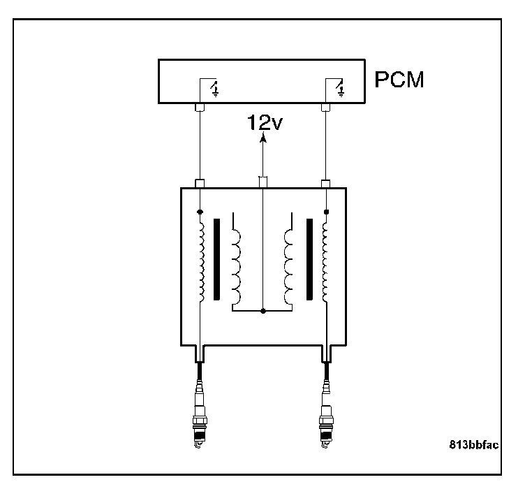 The Ignition Coils are powered by Fuse 11 in the Underhood Accessory Fuse Block. The Powertrain Control Module (PCM) controls the current flow through the primary side of the coils by toggling the control circuits. The secondary voltage is generated when the primary current flow stops, and the magnetic field created by the current flow in the primary windings collapses. The collapsing magnetic field induces a voltage into the secondary windings and creates a high voltage surge that is sent to the spark plug wire.