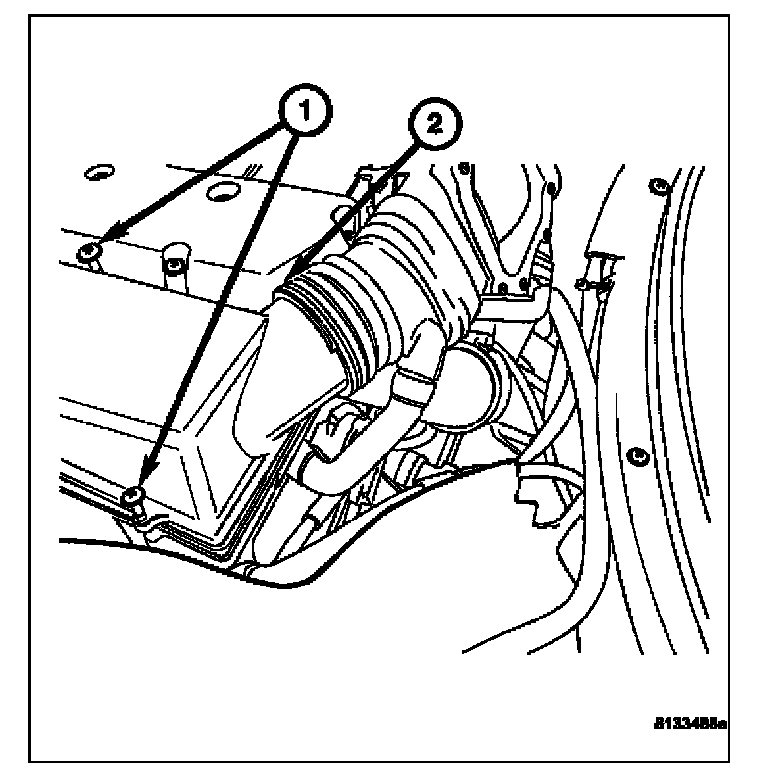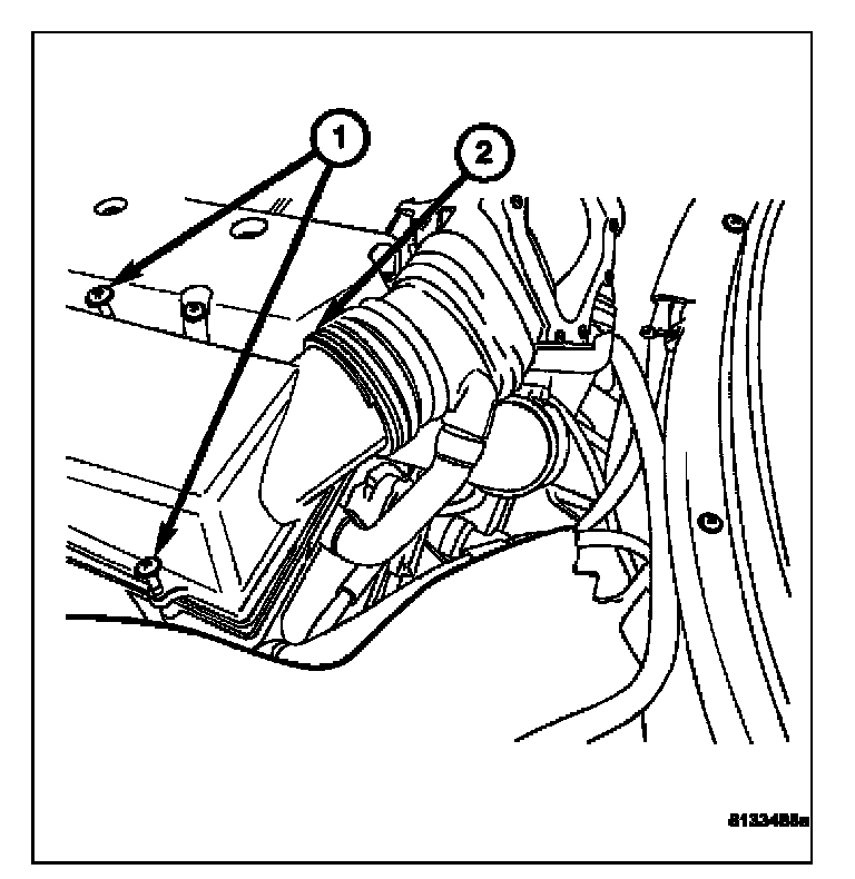 3. Remove the upper air cleaner housing by removing the inlet tube (2) and the retaining screws (1).