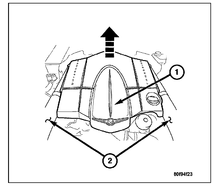 7. Install the engine cover (1). Align the engine cover retaining clips to the rubber mounts, and push down firmly to connect engine cover to rubber/ mounts.