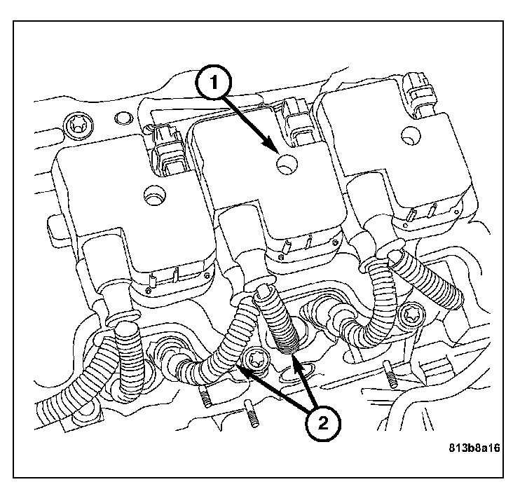6. Remove the ignition coil retaining bolt (2).