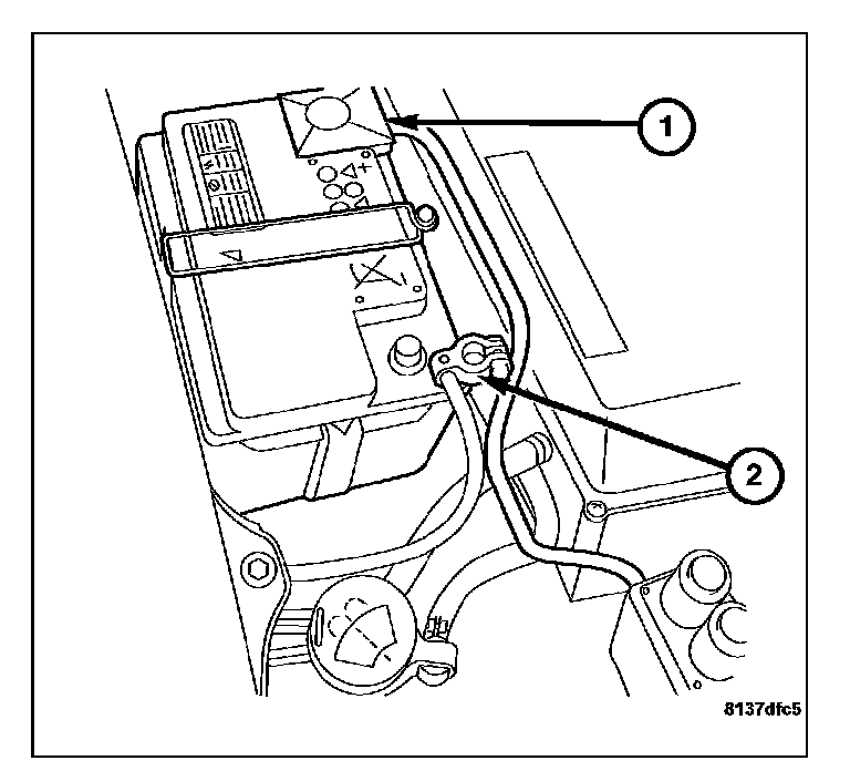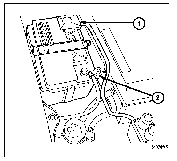 1. Verify the negative battery cable (2) is disconnected before proceeding. Wait two minutes for the system capacitor to discharge before further service.
