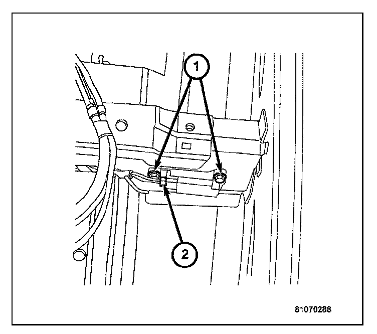 15. Remove the two bolts (1) attaching the side impact sensor to the body cross brace.
