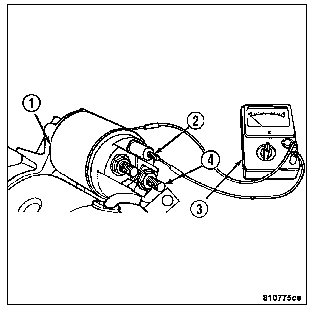 3. Check the solenoid (1) for continuity between the solenoid terminal (2) and the solenoid field coil terminal (4) with a continuity tester (3). There should be continuity. If OK, go to Step 4. If not OK, replace the faulty starter motor assembly.