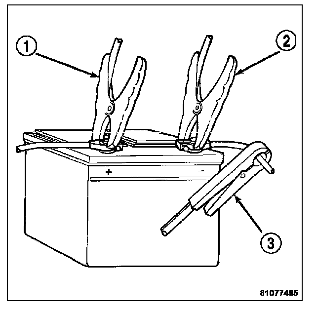 1. Connect a suitable volt-ampere tester (3) to the battery terminals (1,2). See the instructions provided by the manufacturer of the volt-ampere tester being used.