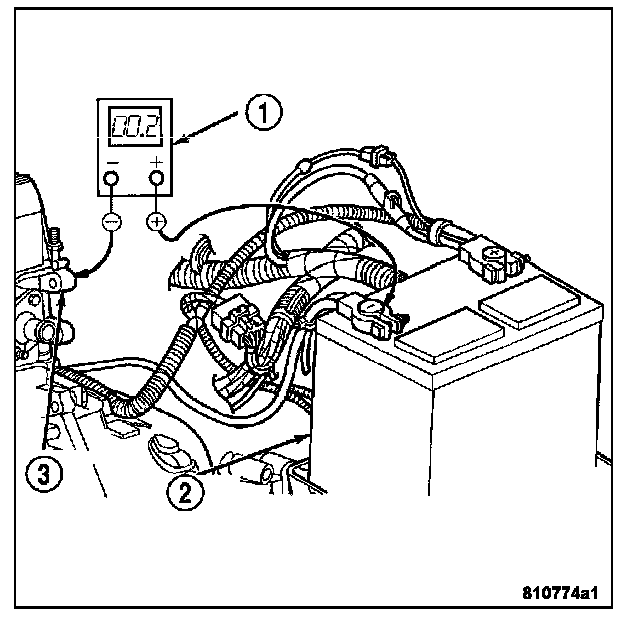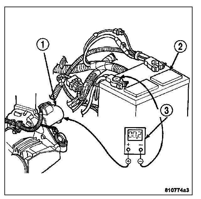 3. Connect the voltmeter (2) to measure between the battery (1) positive terminal post and the starter (3) solenoid battery terminal stud. Rotate and hold the ignition switch in the Start position. Observe the voltmeter. If the reading is above 0.2 volt, clean and tighten the battery cable connection at the solenoid. Repeat the test. If the reading is still above 0.2 volt, replace the faulty battery positive cable.