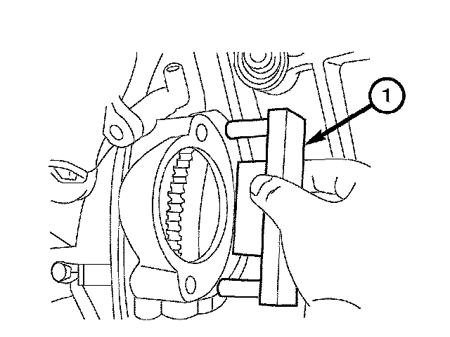 3. Using Special Tool 9102 Flywheel Locking Tool (1), lock the flywheel by inserting the tool in the starter opening.