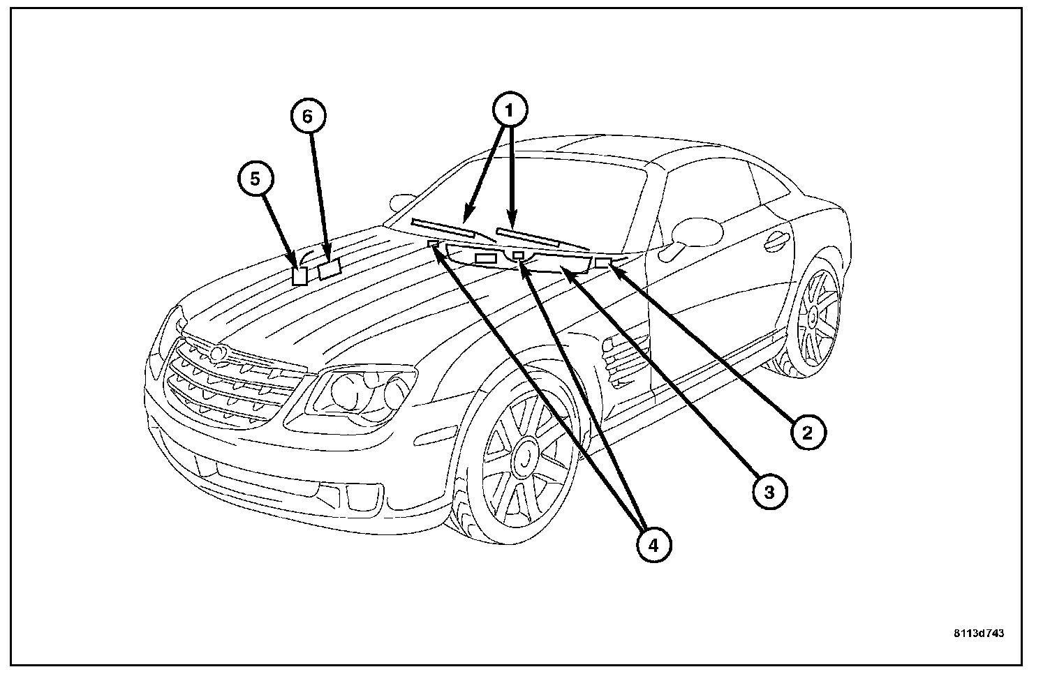 - Washer Nozzles - Two heated washer nozzles (4) are secured into dedicated openings within the cowl grille at the base of the windshield.