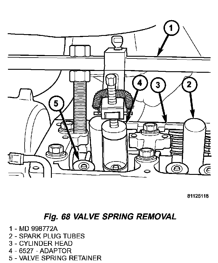 8) Using Tool MD 998772A (1) with adapter 6527 (4) or equivalent, compress valve spring and remove valve locks (5). Release tension on valve spring, remove retainer (5) and valve spring (Fig. 68).
