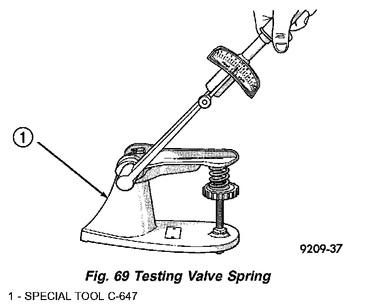 When valves have been removed for inspection, reconditioning or replacement, valve springs should be tested (Fig. 69). As an example; the compression length of the spring to be tested is 38.00 mm (1.496 inch). Turn table of Tool C-647 until surface is in line with the 38.00 mm (1.496 inches.) mark on the threaded stud and the zero mark on the front. Place spring over stud on the table and lift compressing lever to set tone device. Pull on torque wrench until ping is heard. Take reading on torque wrench at this instant. Multiply this reading by two. This will give the spring load at test length. Fractional measurements are indicated on the table for finer adjustments. Refer to Engine Specifications to obtain specified height and allowable tensions. Replace springs that do not meet specifications.