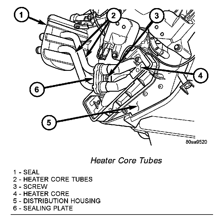 NOTE: The heater core tubes each have a slot that must be indexed to a location tab within each of the heater core ports. Adjust the position of the tubes as required so that the sealing plate fits flush against the heater core supply and return ports, which indicates that the tubes are properly indexed.