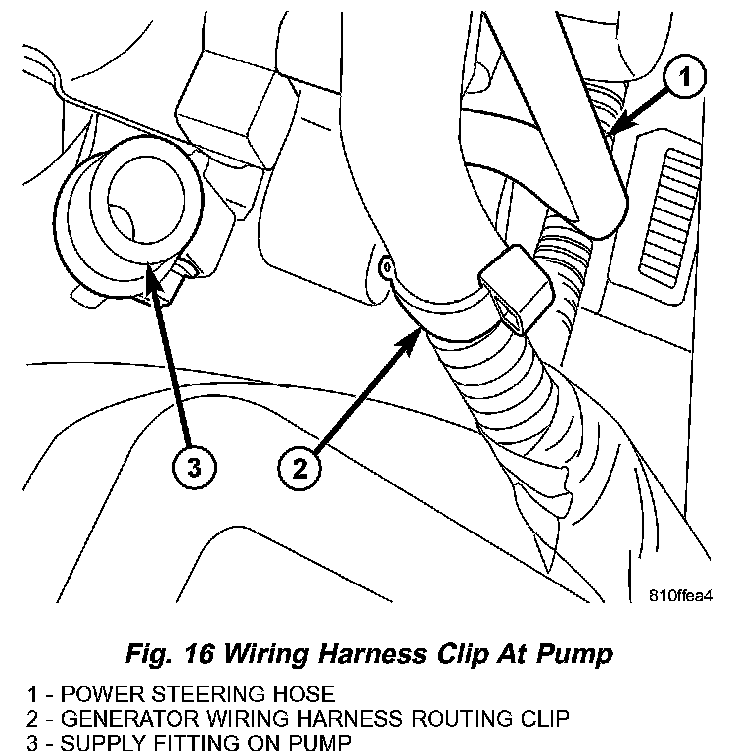 3. Remove generator wiring harness routing clip from pump (Fig. 16).