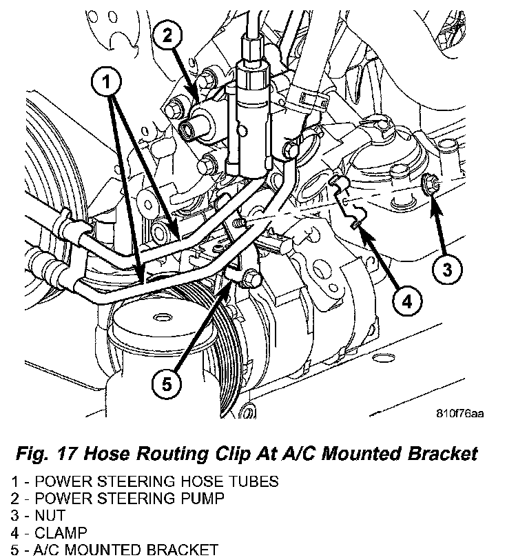 9. Place pressure and return hoses on A/C compressor mounted bracket and install routing clamp and nut (Fig. 17). Tighten nut to 12 Nm (105 inch lbs.) torque.