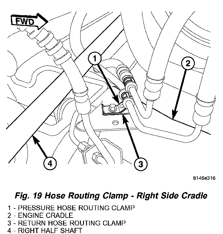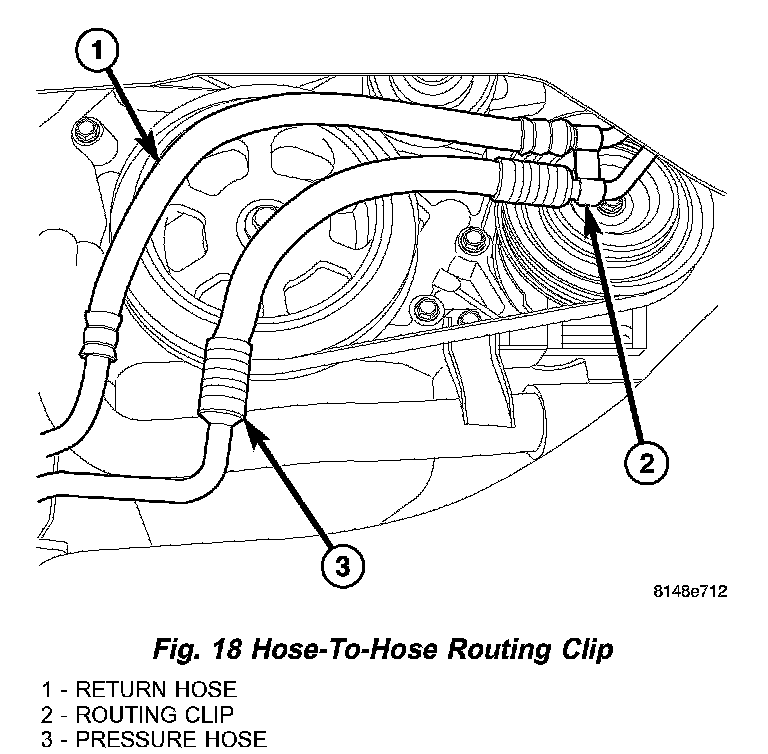 5. Install routing clip securing return hose to pressure hose near drive belt (Fig. 18).