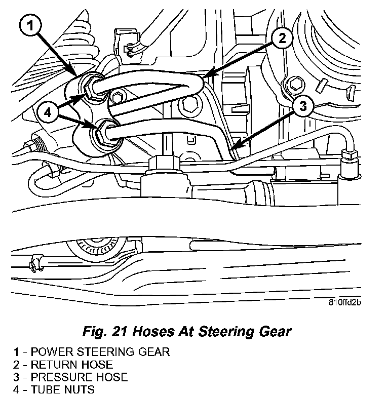 11. Remove tube nut fastening pressure hose to power steering gear (Fig. 21). Remove hose from gear port.