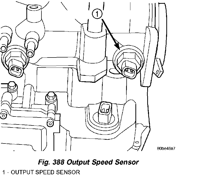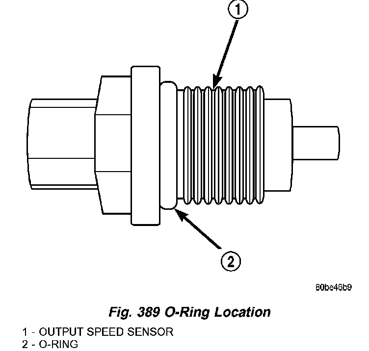 The Output Speed Sensor is a two-wire magnetic pickup device that generates an AC signal as rotation occurs. It is threaded into the transaxle case (Fig. 388), sealed with an O-ring (Fig. 389), and is considered a primary input to the Powertrain/Transmission Control Module.